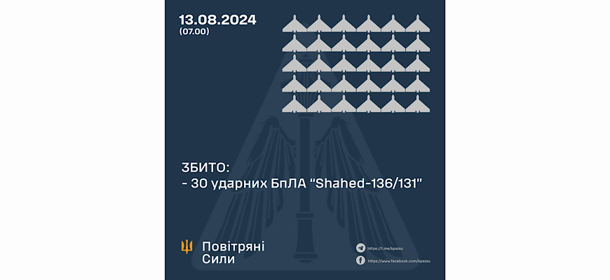 У результаті протиповітряного бою мобільними вогневими групами Сил оборони України, авіацією, зенітними ракетними підрозділами та засобами РЕБ Повітряних Сил збито 30 ворожих БпЛА у Миколаївській, Вінницькій, Сумській, Кіровоградській, Херсонській, Чернігівській, Дніпропетровській та Черкаській областях.