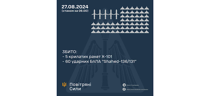 У ніч на 27 серпня 2024 року радіотехнічними військами Повітряних Сил виявлено та супроводжено 91 засіб повітряного нападу противника.
