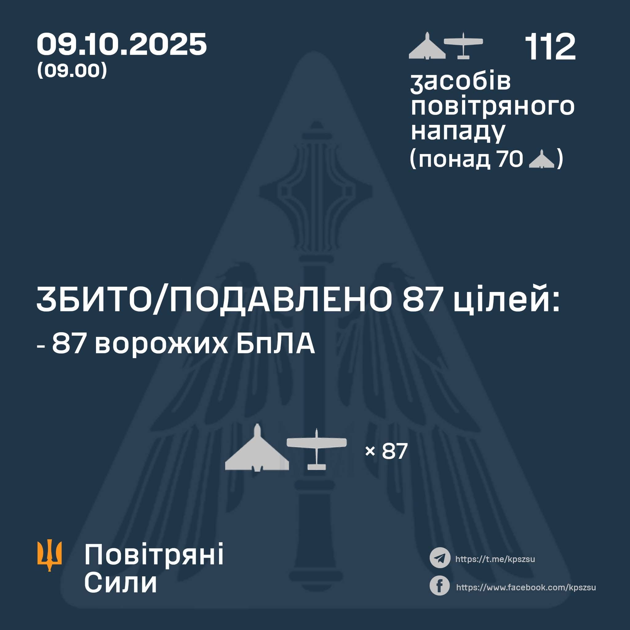 У ніч на 09 жовтня (із 19.00 08 жовтня) противник атакував 112-ма ударними БпЛА типу Shahed, Гербера та безпілотниками інших типів із напрямків: Міллерово, Курськ, Шаталово, Приморсько-Ахтарськ – рф, понад 70 із них – «шахеди».
