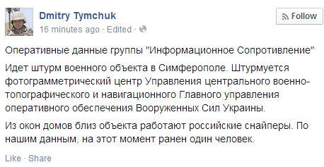 "Оперативні дані групи "Інформаційний спротив". Іде штурм військового об'єкта в Сімферополі. Штурмується фотограмметричний центр Управління центрального військово-топографічного й навігаційного Головного управління оперативного забезпечення Збройних Сил України", - написав він.