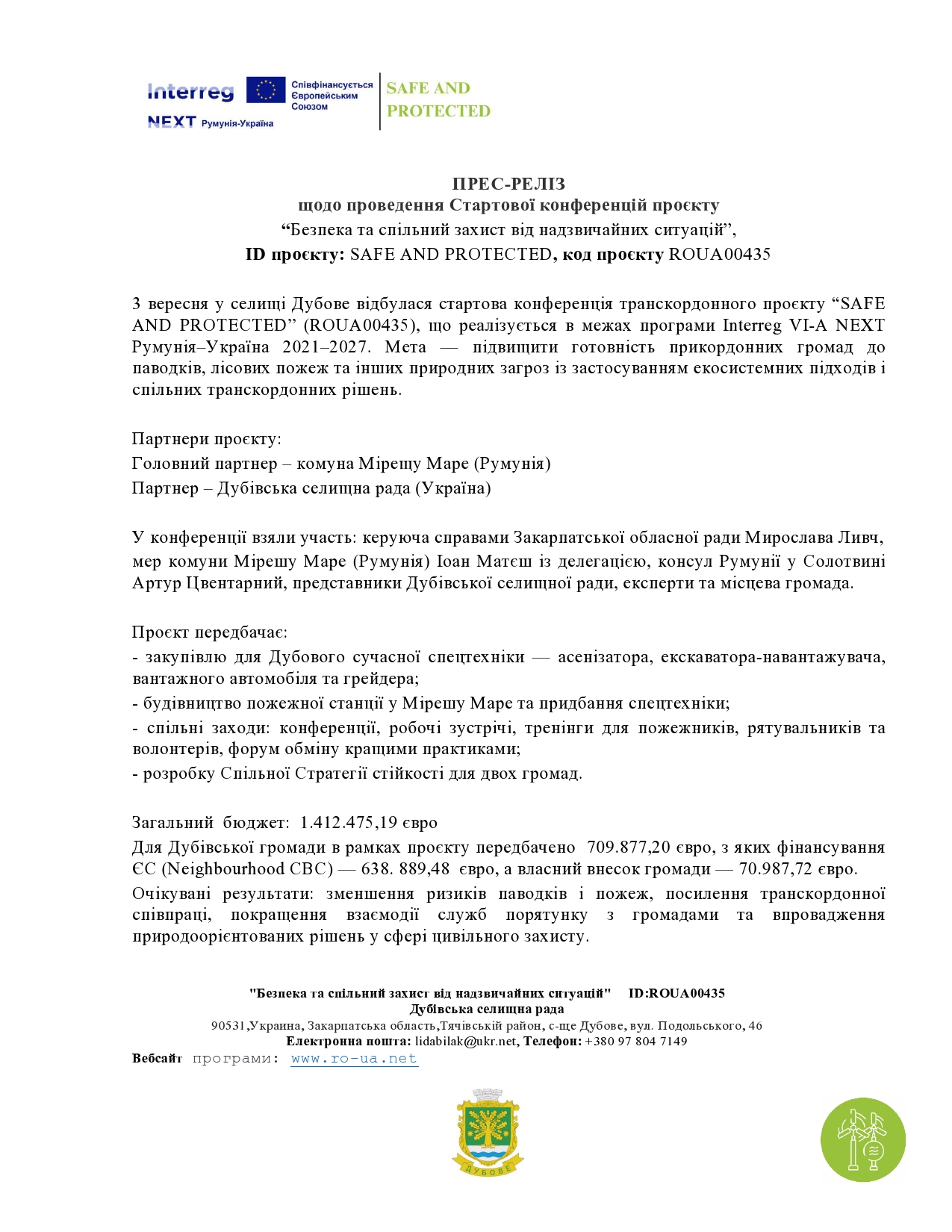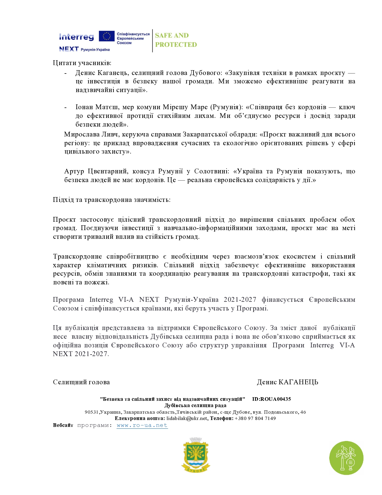 «Закупівля техніки в рамках проєкту — це інвестиція в безпеку нашої громади. Ми зможемо ефективніше реагувати на надзвичайні ситуації», - прокоментував Денис Каганець, селищний голова Дубового. Іонан Матєш, мер комуни Мірешу Маре (Румунія) зауважив, що «Співпраця без кордонів — ключ до ефективної протидії стихійним лихам. Ми об’єднуємо ресурси і досвід заради безпеки людей».