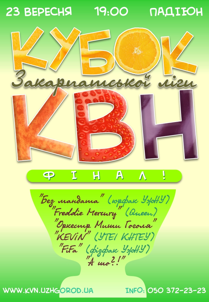 Грають команди: "Без мандата" (юрфак УжНУ), "Freddie Mercury" (Queen), "Оркестр Миши Гоголя", "KEVIN" (УТЕІ КНТЕУ), "FiFa" (фізфак УжНУ), "А шо?!" .