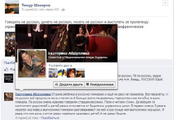 "Отдала ребенка в русскую гимназию и еще ни разу не пожалела. Все предметы по русски все предельно ясно и понятно. А больше всего понравилась торжественная линейка я даже плакала. По русски очень красиво говорили старшеклассники. Пели и читали стихи. Да вобщем то контингент родителей и детей резко отличается от быдлячих украинских школ. В первом классе 3 раза в неделю укр мова, и выпускники разговаривают на ней куда лучше чем выпускники укр школ. Я рада, что моя дочь учится среди морально здоровых детей. А не среди быдла", - написала Абдулліна (орфографія і пунктуація збережені).