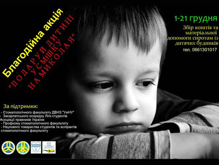 В університеті почалася акція «Подаруй дитині усмішку на Миколая», під час якої збирають кошти й усіляку можливу матеріальну допомогу (іграшки, одяг) для сиріт із дитячих будинків. Усі гроші й подарунки передадуть дітям у переддень Святого Миколая, – повідомляє офіційний сайт УжНУ.
