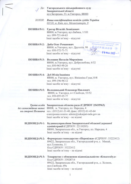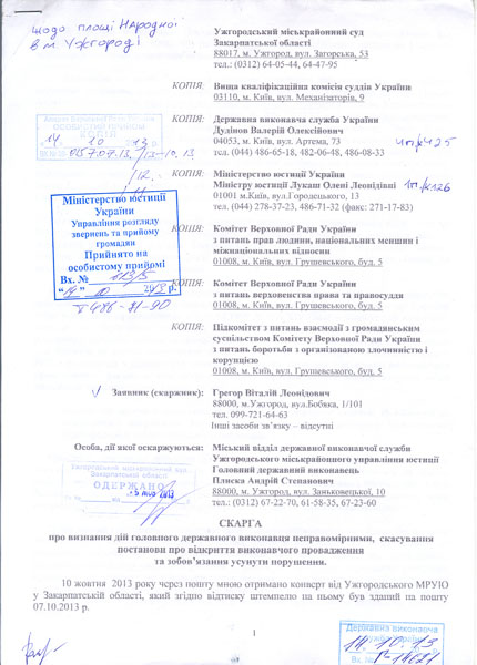 Вчора, 16 жовтня, до Ужгородського міськрайонного суду подано скаргу про визнання дій головного державного виконавця неправомірними, скасування постанови про відкриття вионавого впровадження та зобов’язання усунути порушення.