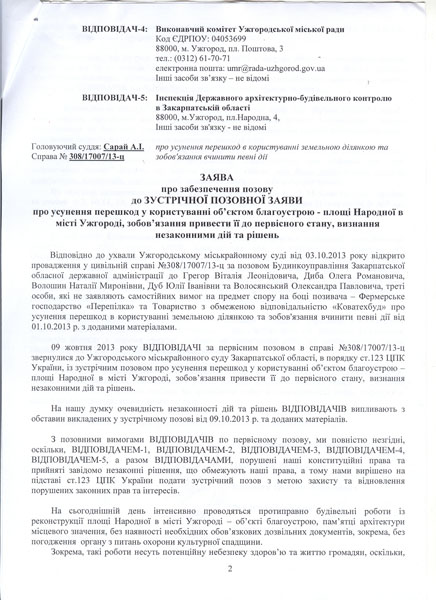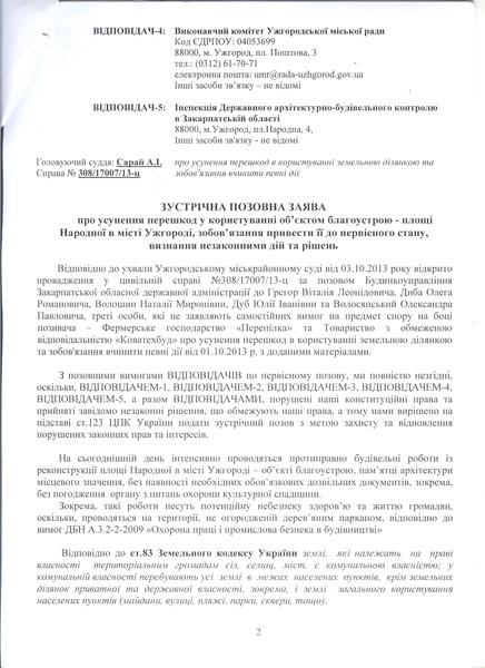 Ужгородський міськрайонний суд відмовив у задоволенні зустрічного позову, поданого активістами 9 жовтня проти забудовників площі Народної . Про це Zaholovok.com.ua повідомив Віталій Грегор, правозахисник.
