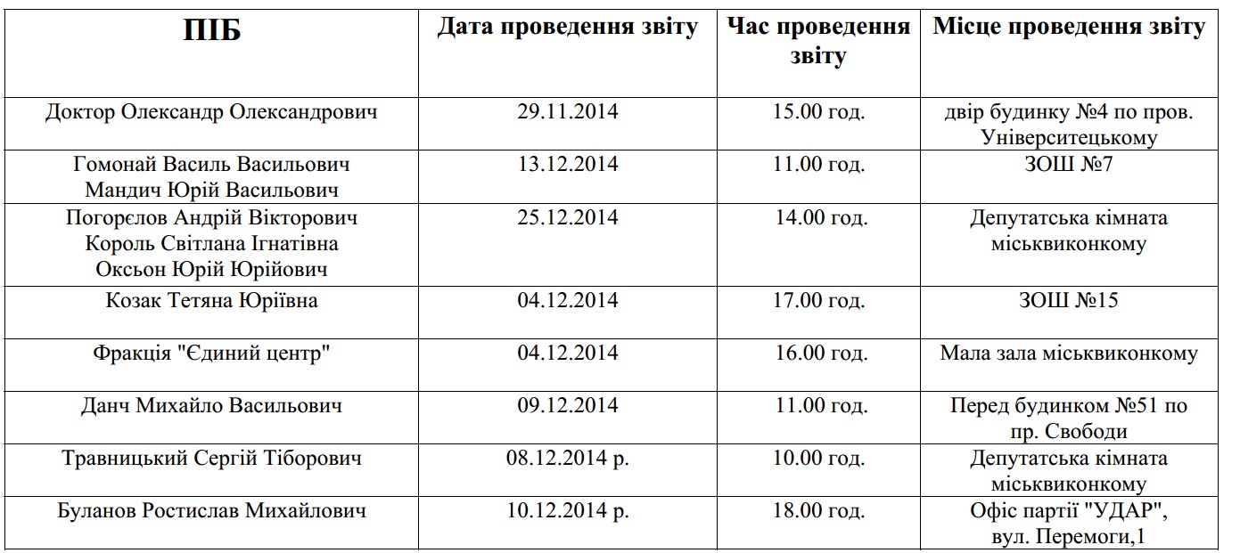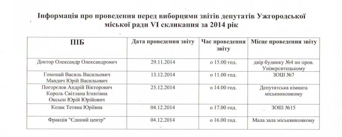 Ужгородська міськрада оприлюднила дати звітів місцевих депутатів міста Ужгород за листопад - грудень 2014 року.