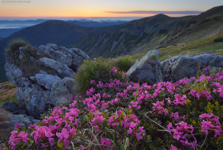 Цвітіння рододендронів на найвищому хребті України – Чорногорі – чи не найзахопливіше природне явище у Карпатах. На початку червня яскравий рожевий килим квітів рододендрона, який в народі називають «червоною рутою», вкриває схили Чорногори.