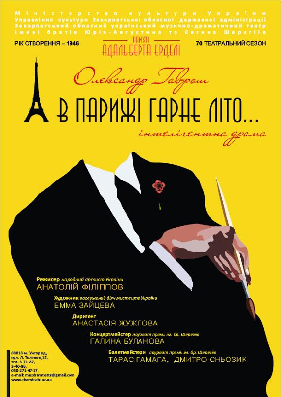 Виставу «В Парижі гарне літо» покажуть в Мукачівському обласному театрі драми і комедії у п’ятницю 1 липня о 18.00. А о 17.00 в приміщенні театру відбудеться зустріч керівництва ужгородського театру з журналістами. Також буде презентовано книжку Олександра Гавроша «Таємниця Ерделі», яка днями побачила світ у видавництві Олександри Гаркуші.