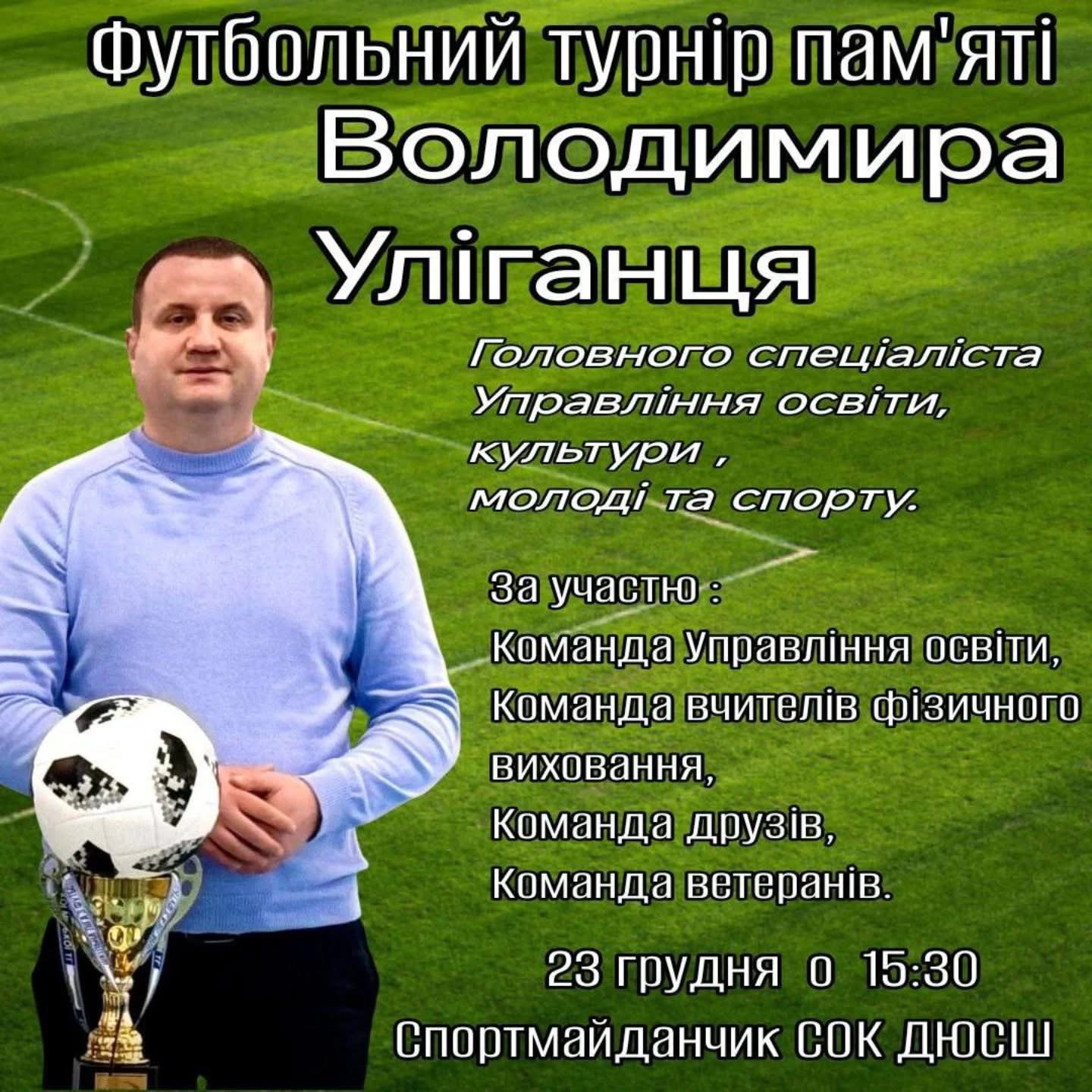 Футбольний турнір відбудеться 23 грудня о 15:30 на спортмайданчику СОК ДЮСШ. Запрошуються всі охочі підтримати учасників та вшанувати пам’ять Володимира Уліганця.