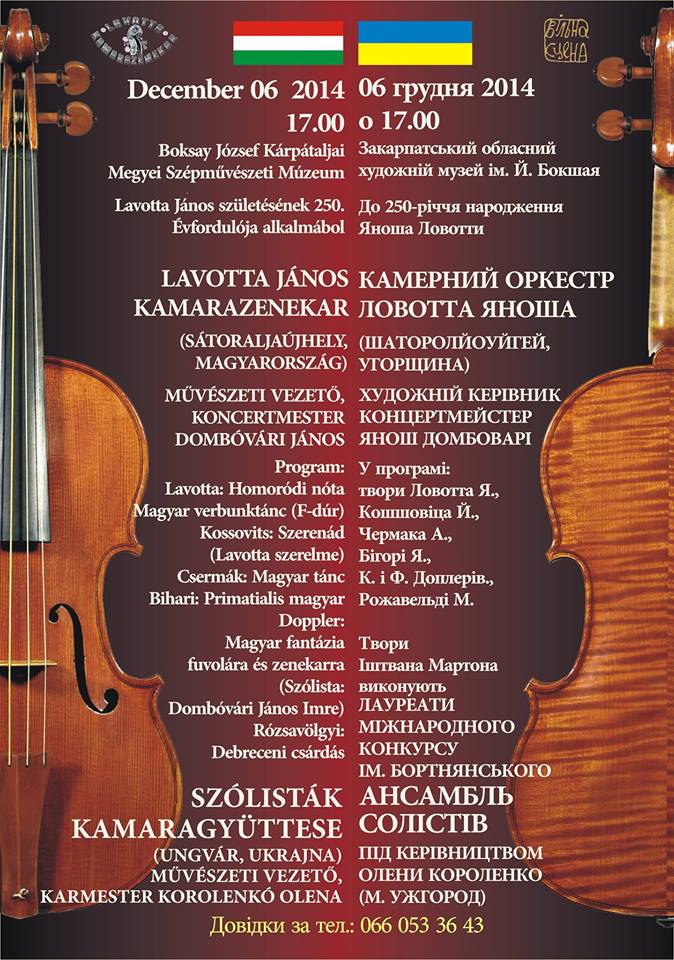 6 грудня о 17.00 у залі Закарпатського обласного художнього музею ім.Й.Бокшая відбудеться спільний концерт Камерного оркестру Яноша Ловотта з м. Шаторолйоуйгей (Угорщина) та Ансамблю солістів під керівництвом Олени Короленко.