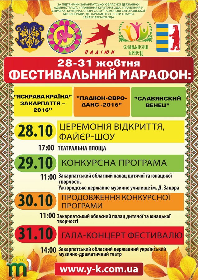 В рамках марафону одночасно відбудуться одразу чотири конкурси: ІIІ Всеукраїнський відкритий фестиваль-конкурс сучасної дитячо-юнацької творчості "Яскрава країна Закарпаття-2016", ІІI Всеукраїнський відкритий дитячо-юнацький фестиваль-конкурс національних культур та народної творчості "Яскрава країна Закарпаття-2016", Міжнародний фестиваль-конкурс дитячої та юнацької хореографії "ПАДІЮН-ЄВРОДАНС-2016" і Міжнародний фестиваль-конкурс "Славянский Венец", який зазвичай проходить на теренах Болгарії.