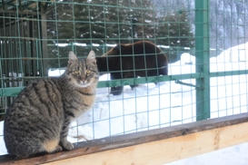 Кіт подружився навіть з ведмедями. Сидить біля вольєрів та спостерігає то за поважною ходою Дюрія, який почувається тут господарем, то за Потапом з Бубочкою.