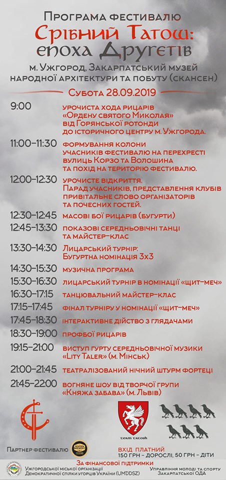 На відвідувачів свята чекає насичену програма, що розпочнеться о 12:00 парадом лицарів і завершиться увечеріяскравим вогняним шоу. Упродовж дня на території музею архітектури та побуту та у рові Ужгородського замку відбуватимуться глядачі зможуть подивитися на запеклі поєдинки лицарів, потанцювати середньовічні танки разоміз колективом «Княжа забава» (м. Львів) та послухати музику у виконанні музичного гурту із Білорусі «Літа Талер».