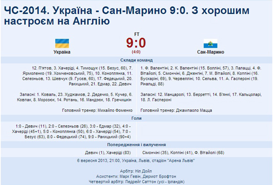 Сьогодні, 6 вересня, в матчі відбірної групи на Чемпіонату світу - 2014 зустрілися збірна України і збірна Сан-Марино. Матч відбувся у Львові на стадіоні «Арена Львів». Українська збірна перемогла суперників з рахунком 9:0.