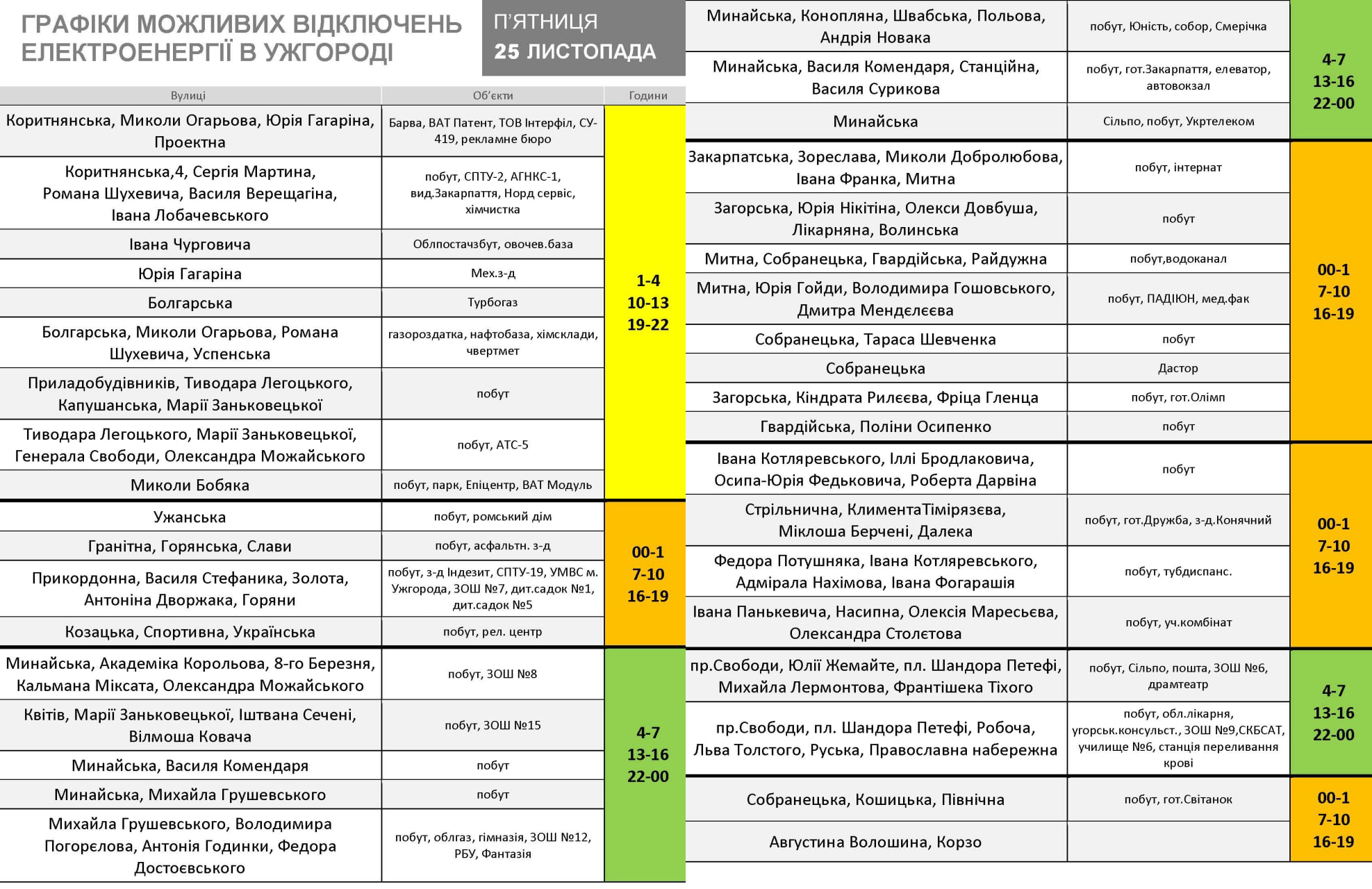 Заплановані графіки МОЖЛИВИХ погодинних відключень електроенергії в Ужгороді на завтра, 25 листопада.