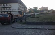 З самого ранку підприємець, який викупив ділянку на клумбі Закарпатського облмуздрамтеатру, почав будівельні роботи.