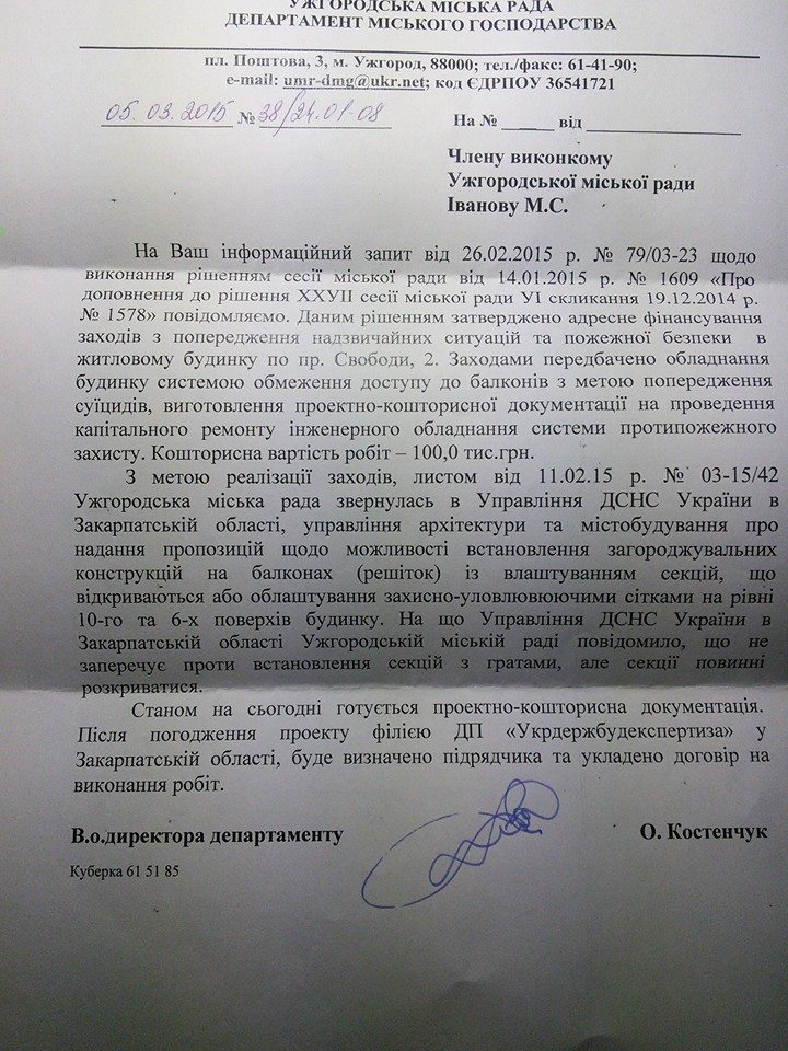 Бюрократія безсмертна — навіть враховуючи той факт, що пройшло вже майже два місяці після прийняття рішення депутатським корпусом щодо попередження надзвичайних ситуацій, що мають місце в будівлі на проспекті Свободи 2. Щиро сподіваюсь, що за час, поки готується документація та очікується наступний етап впроваждення рішення, жодна людина більше не стрибне з балкону цієї будівлі", - пише хлопець.