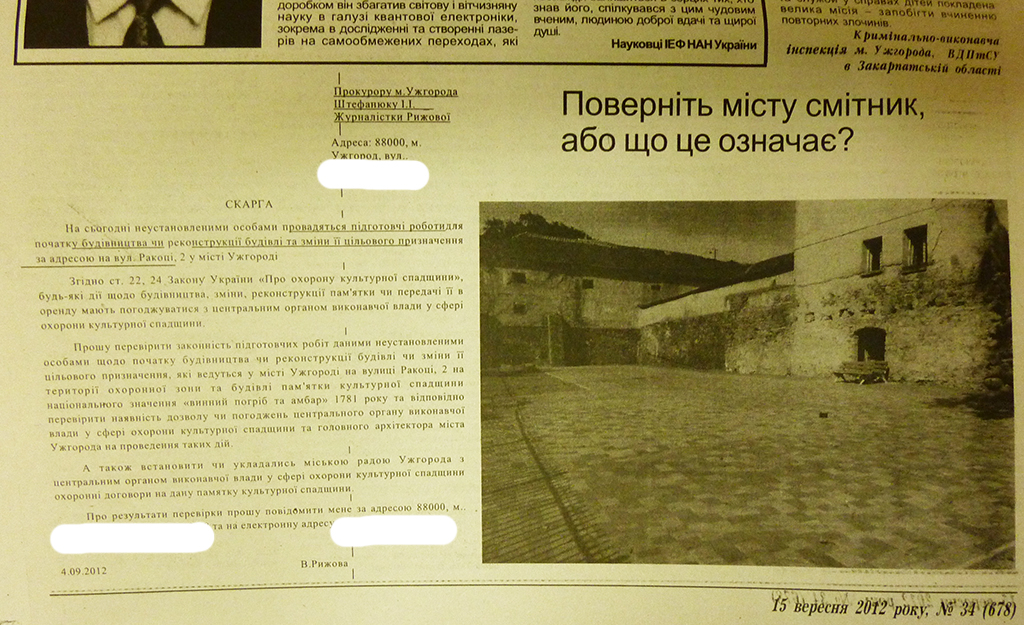 4 вересня року в рамках журналістського розслідування В.Рижова звернулась із скаргою до Прокуратури м. Ужгорода з проханням перевірити законність підготовчих робіт щодо початку будівництва чи реконструкції будiвлi чи змiни її цільового призначення, які ведуться у мiстi Ужгород на вулиці Ракоцi, 2 на територiї охоронної зони та будiвлi пам’ятки культурної спадщини національного значення «Винний погріб та амбар» 1781 року та вiдповiдно перевірити наявність дозволу чи погоджень центрального органу виконавчої влади у сферi охорони культурної спадщини та головного архiтектора мiста Ужгорода на проведення таких дiй.