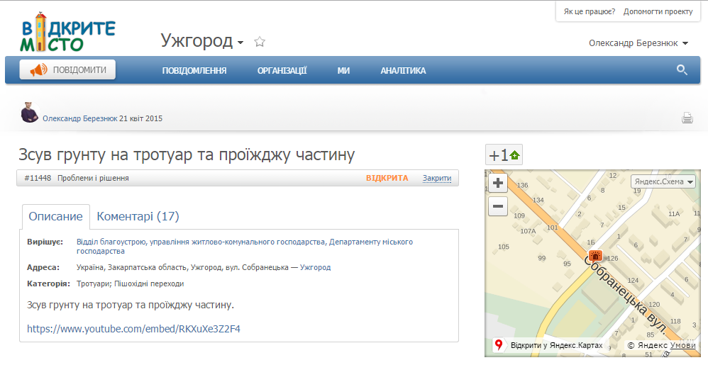 Рівно рік тому активіст опублікував відео-ролики на YouTube про одне проблемне місце, яке дошкуляє мешканцям Ужгорода вже кілька років. З появою проекту «Відкрите місто» вирішив звернутись по допомогу.