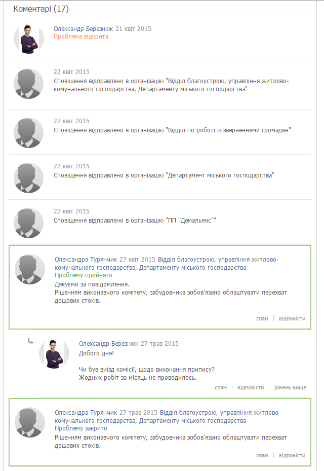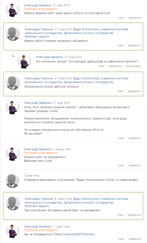 "За фактом маємо очевидний факт тотальної бездіяльності відділу благоустрою та управління ЖКГ в купі з ДМГ. Маємо аж 3 органи: 1-відділ, 1-управління, 1-департамет, які абсолютно недієві. Проблему відкриваю вже четвертий раз!