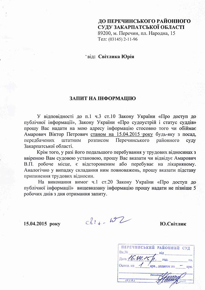 Сьогодні активісти Євромайдану подали запит щодо статусу судді Амаровича, який, знаходячись в нетверезому вигляді за кермом потрапив у ДТП із смертельними наслідками.