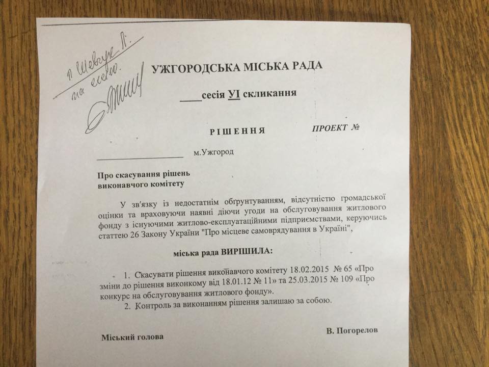 "Сьогодні, в порушення процедури, Погорелов подав проект рішення про скасування призначеного публічного конкурсу ( який має відбутися в кінці місяця ) на відбір підприємств, які будуть працювати замість ЖРЕРІВ. ( рішення виконком прийняв тиждень тому ). Це говорить про те, що на публічному конкурсі вони себе не почувають впевнено, тому навіть після публічного розголосу, Погорелов демонстративно і вперто робить подальші спроби передачі всієї сфери ЖКХ Ужгороду мукачівцям в обмін на свою посаду, яку йому повернули через суд", -припускає чиновник.