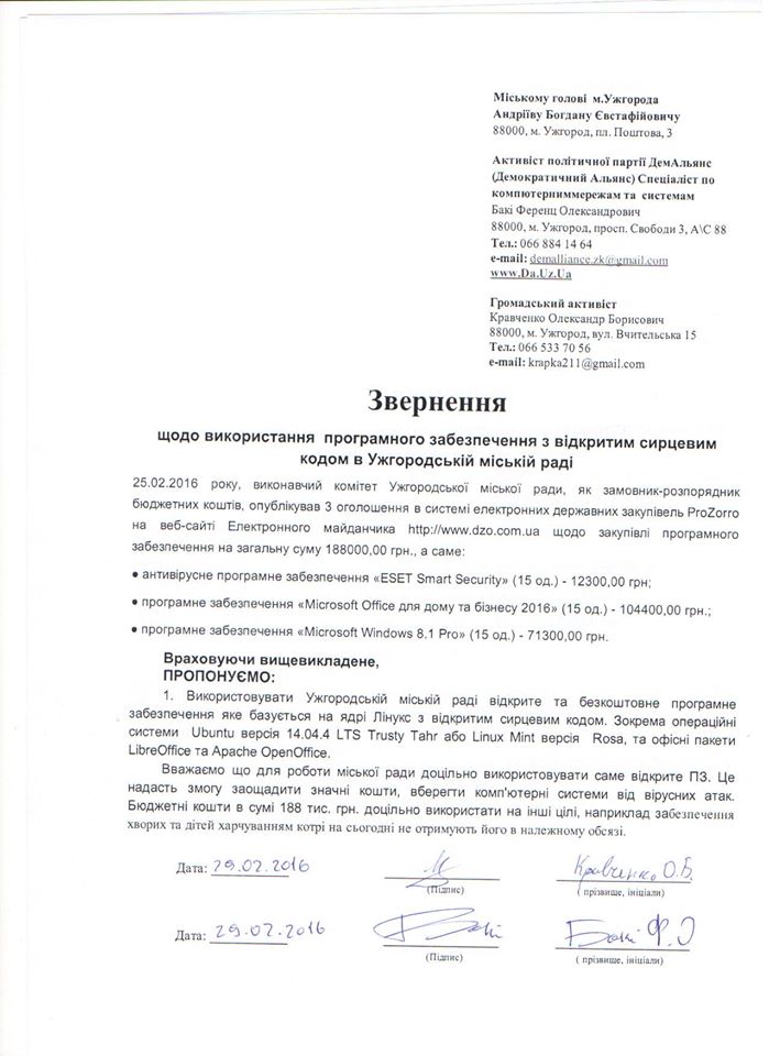 Ужгородські активісти Ференц Бакі та Олександр Кравченко подали звернення до міського голови Богдана Андріїва щодо використання програмного забезпечення з відкритим сирцевим кодом в Ужгородській міськраді.