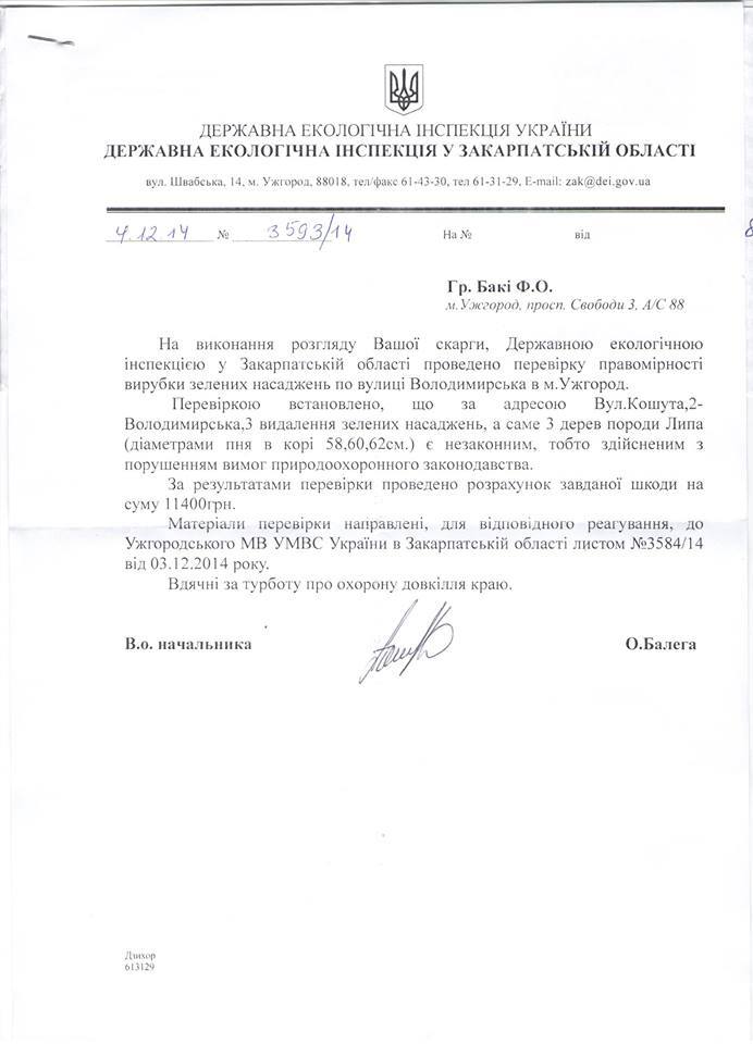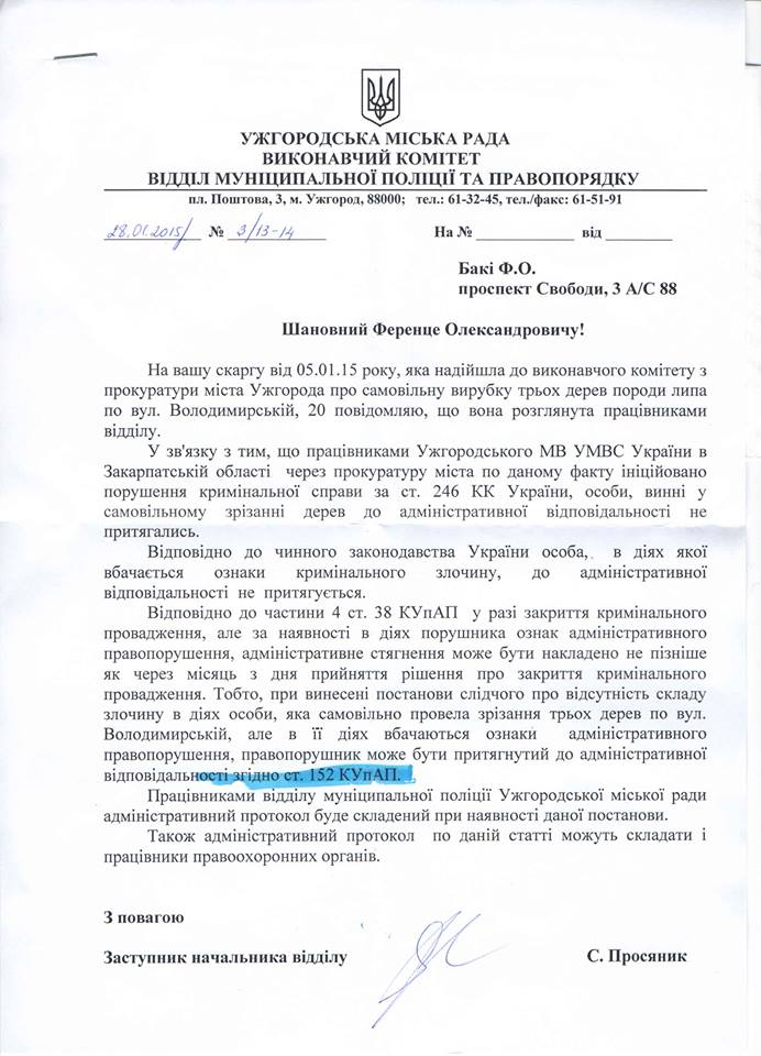 "Відділ муніціпальної поліції та правопорядку Ужгородської Міськради прикриває злочинців. Замість стягнення завданої шкоди в 11400 грн. вони вирішили накласти штраф по зовсім іншій статті, це ст.152 КУпАП - порушення стандартів благоустрою, згідно якому штраф складає від 50-100 неоподаткованих мінімумів (850-1700грн.). Нагадаємо їм що за пошкодження зелених насаджень або самовільне знесення, а також невжиття засобів з охорони та утримання винні особи притягуються до відповідальності згідно зі ст.153 Кодексу України «Про адміністративні правопорушення». Накладання штрафу не звільняє винних осіб від обов’язків сплати відшкодування за нанесені збитки, згідно з постановою Кабінету міністрів України від 28.12.02 №1789 та п.3 ст.42 Закону України «Про благоустрій населених пунктів»,- написав активіст.