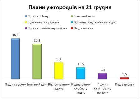 Для більшості мешканців Ужгорода 21 грудня буде звичайним днем: для 31,5 % ужгородців ця п’ятниця – звичайний будній день, 36, 3 % опитаних відповіли, що вони планують піти на роботу, 15 % проведуть вечір п’ятниці в колі сім'ї та близьких, а 10, 5 % мешканців міста, не зважаючи на попередження із заголовків ЗМІ щодо кінця світу, планують відсвяткувати особисту подію (дні народження рідних, колег та корпоративи). 5,3 % опитаних в цей день планують відвідати тематичні вечірки.
