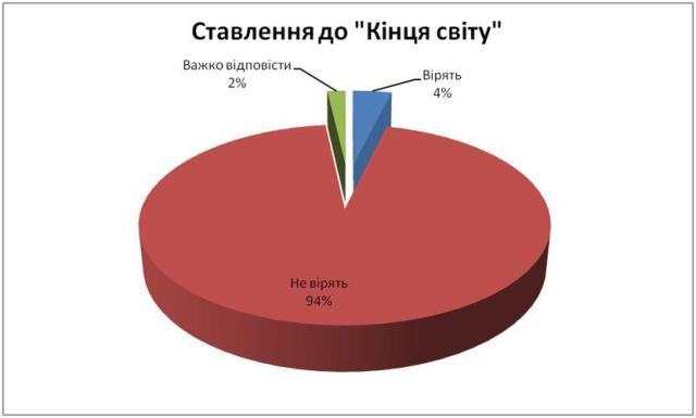 Таким чином, більшість мешканців Ужгорода не тільки не готуються до кінця світу, але й не вірять в нього, - відзначають спеціалісти відділу маркетингових досліджень компанії «ПОШУК». До речі, команда компанії також у можливість кінця світу 21 грудня не вірить.