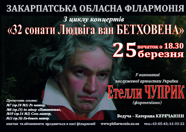 Закарпатська обласна філармонія запрошує 25 березня, у середу, на захід із циклу концертів «32 сонати Людвіга ван БЕТХОВЕНА».