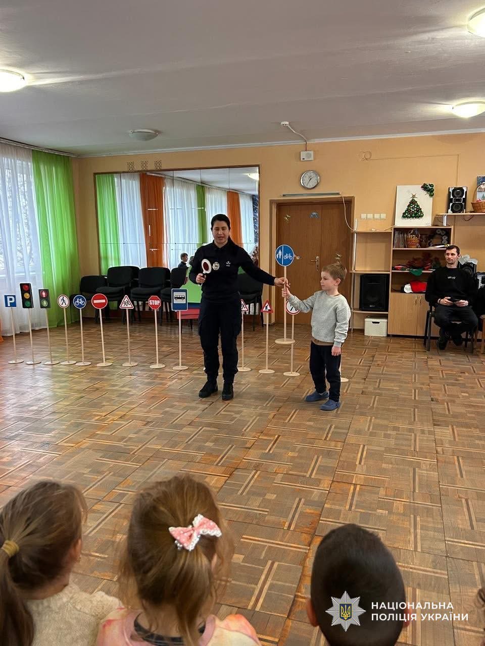 Спершу правоохоронниця відвідала НВК «Веселка», де провела заняття з безпеки дорожнього руху. Інтерактив вийшов ще цікавішим за допомогою муляжів дорожніх знаків. Тетяна роз’яснила дітям основні Правила дорожнього руху для пішоходів та нагадала, як безпечно поводитися на вулиці й поблизу проїжджої частини.