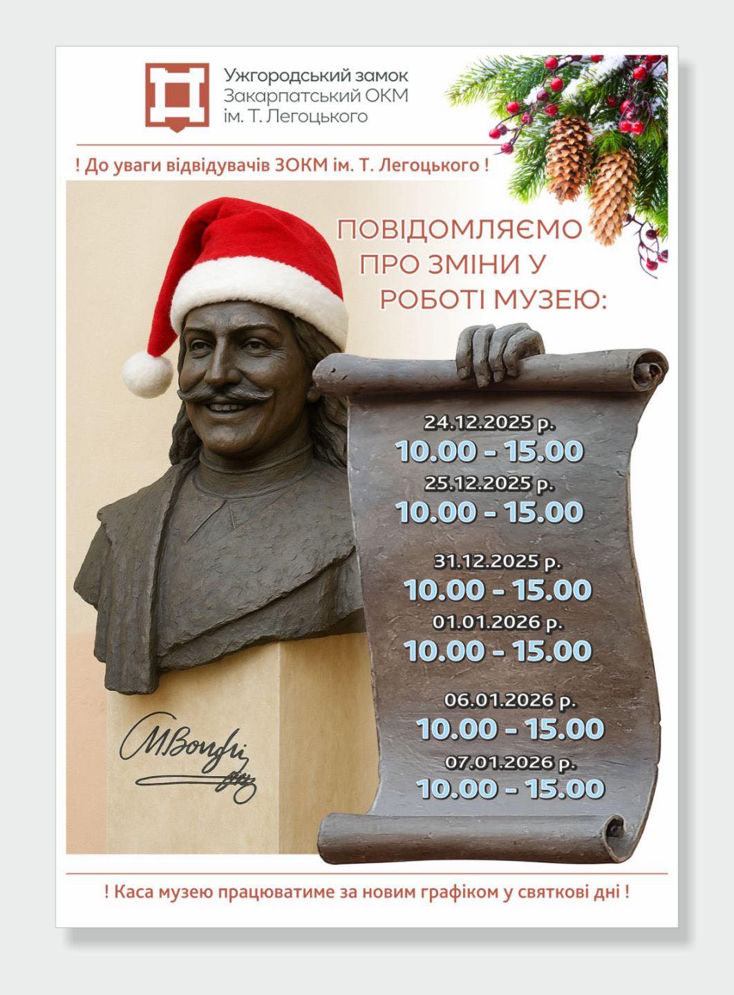 Під час різдвяних свят Ужгородський замок працюватиме за новим графіком – з 10:00 до 15:00. Про це у пʼятницю, 12 грудня, повідомили у соцмережах Закарпатського обласного краєзнавчого музею ім. Тиводара Легоцьгого.