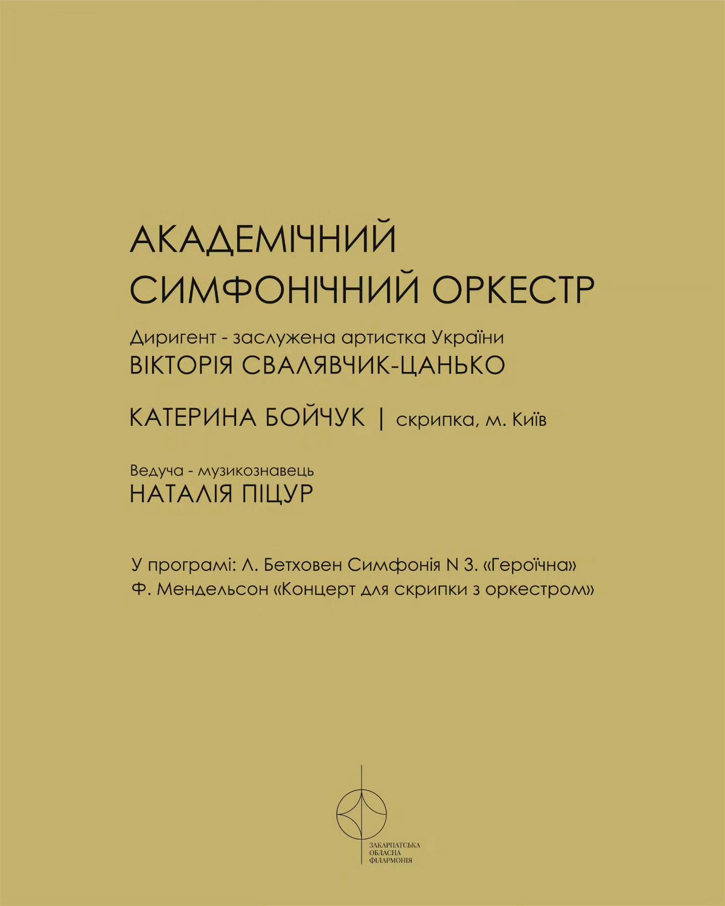 У четвер, 19 березня, у Закарпатській обласній філармонії відбудеться вечір великої симфонічної класики. У програмі – Симфонія №3 «Героїчна» Людвіга ван Бетховена та «Концерт для скрипки з оркестром» Фелікса Мендельсона. Під час заходу збиратимуть кошти для українських військових.