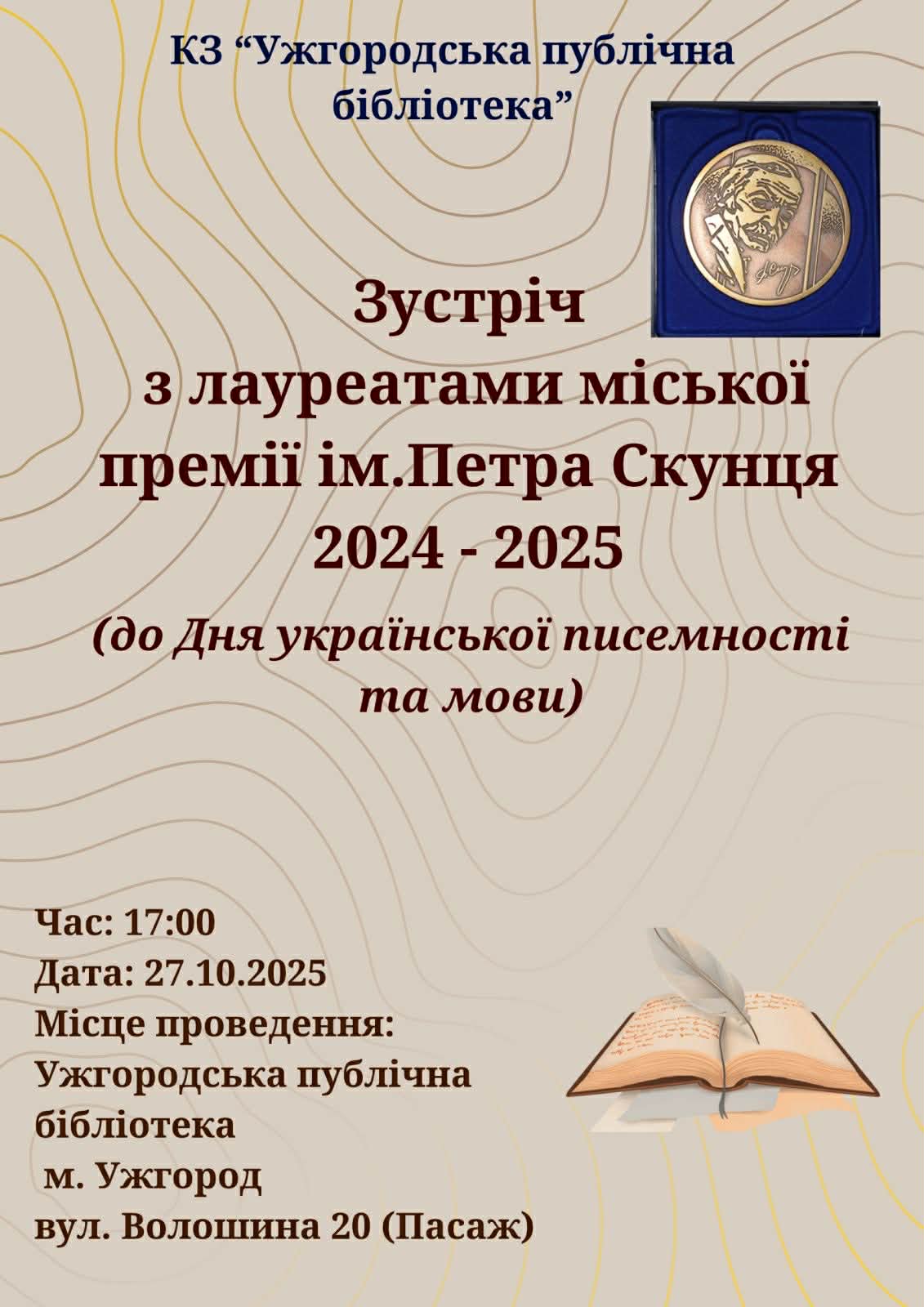 У понеділок, 27 жовтня в Ужгородській публічній бібліотеці (Пасаж) у День української писемності та мови відбудеться творча зустріч із лауреатами Ужгородської міської премії імені Петра Скунця.