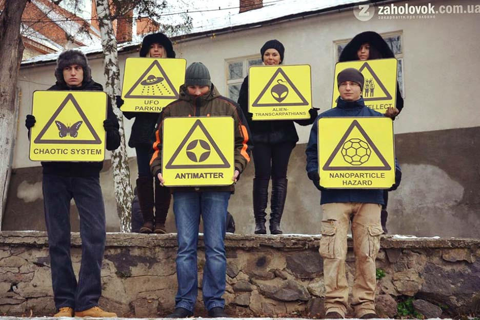 Сьогодні, 12 грудня, на Поштовій площі в Ужгороді чекали на НЛО і "презентували знакову систему УФО-зони, яка розміститься в місті. Захід відбувся 12.12.12р о 12:12 к.ч., тому що саме ця дата і такий час є унікальними. Наразі ми намагаємося знайти місце, де ці знаки можна буде встановити стаціонарно. Головне щоб публіка реагувала на них позитивно, адже метою атракції є створення хорошого іміджу Ужгорода серед туристів", - розповіла куратор акції, студентка кафедри туризму УжНУ, Юля Бонкало.