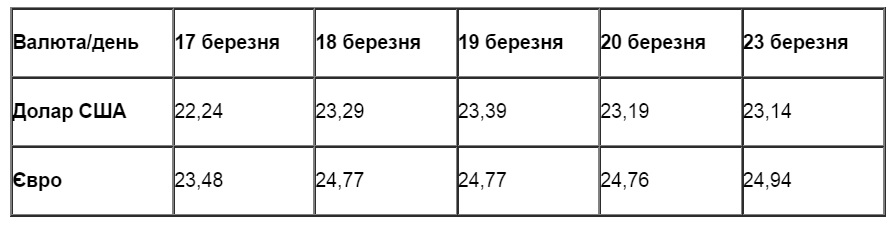 Сьогодні, 23 березня, як і минулої п'ятниці, в офіційних курсах валют Національного банку України подешевшав долар США. Цього разу - на п'ять копійок і зафіксувався на рівні 23,14 гривні. Євро навпаки подорожчав на 18 копійок – до 24,94 гривні.