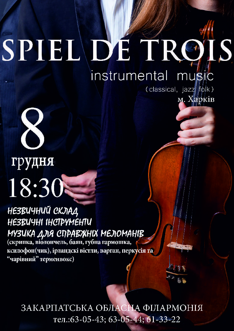 8 грудня у Закарпатській обласній філармонії відбудеться цікава подія: до Ужгороду вперше приїде classic-jazz-folk-гурт «SPIEL DE TROIS» (м.Харків).