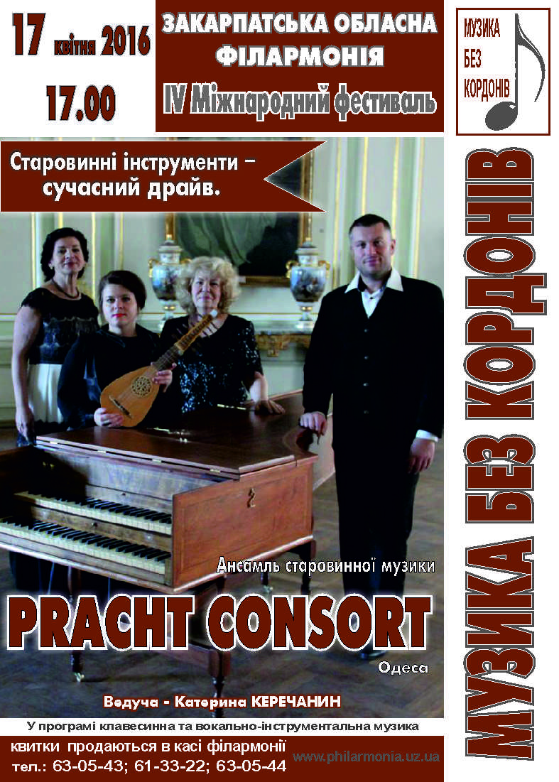 Оригінальні нотки до цієї музичної мапи додадуть гості із півдня України: 17 квітня у Закарпатській обласній філармонії виступить Ансамбль старовинної музики «PRACHT CONSORT» із сонячної Одеси. У складі колективу лауреати міжнародних конкурсів Андрій Прахт (клавесин), Олена Ріхтер (сопрано), Наталія Скрябіна (мандоліна) та Людмила Глєбова (клавесин).