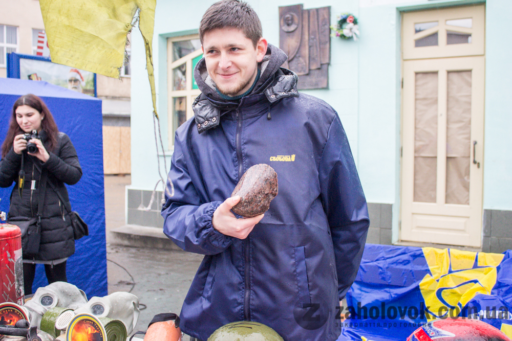 Окрім того на площі також презентували трофеї та різні пам'ятні речі з Майдану, а саме щити, каски, підборіддя київського Леніна, бруківку, вогнегасник, з якого поливали Кличка тощо. Всі ці речі ВО “Свобода” вирішила на честь свята урочисто передати до музею.