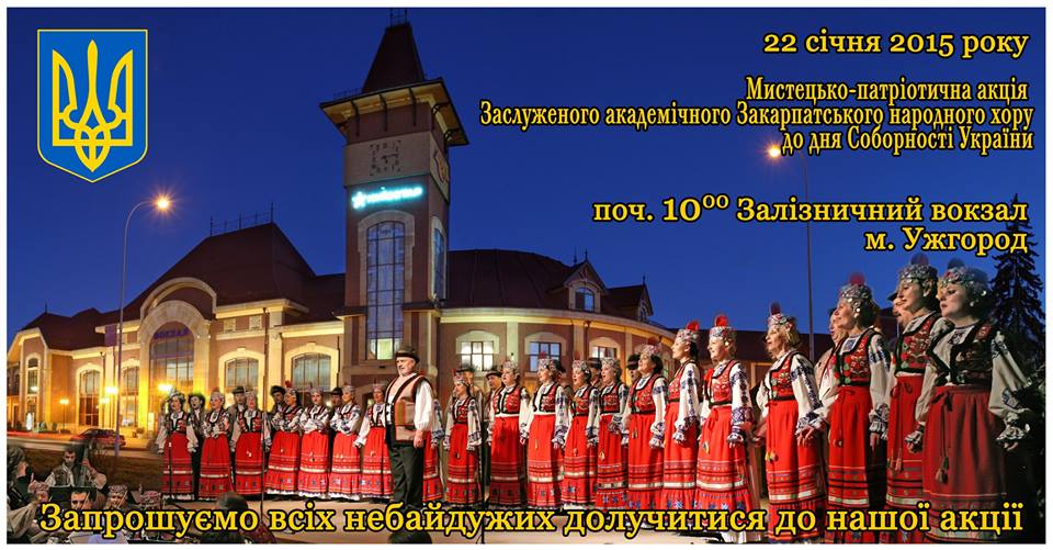 «Заслужений академічний Закарпатський народний хор вперше у приміщенні Ужгородського залізничного вокзалу проводить мистецько-патріотичну акцію до Дня Соборності України.