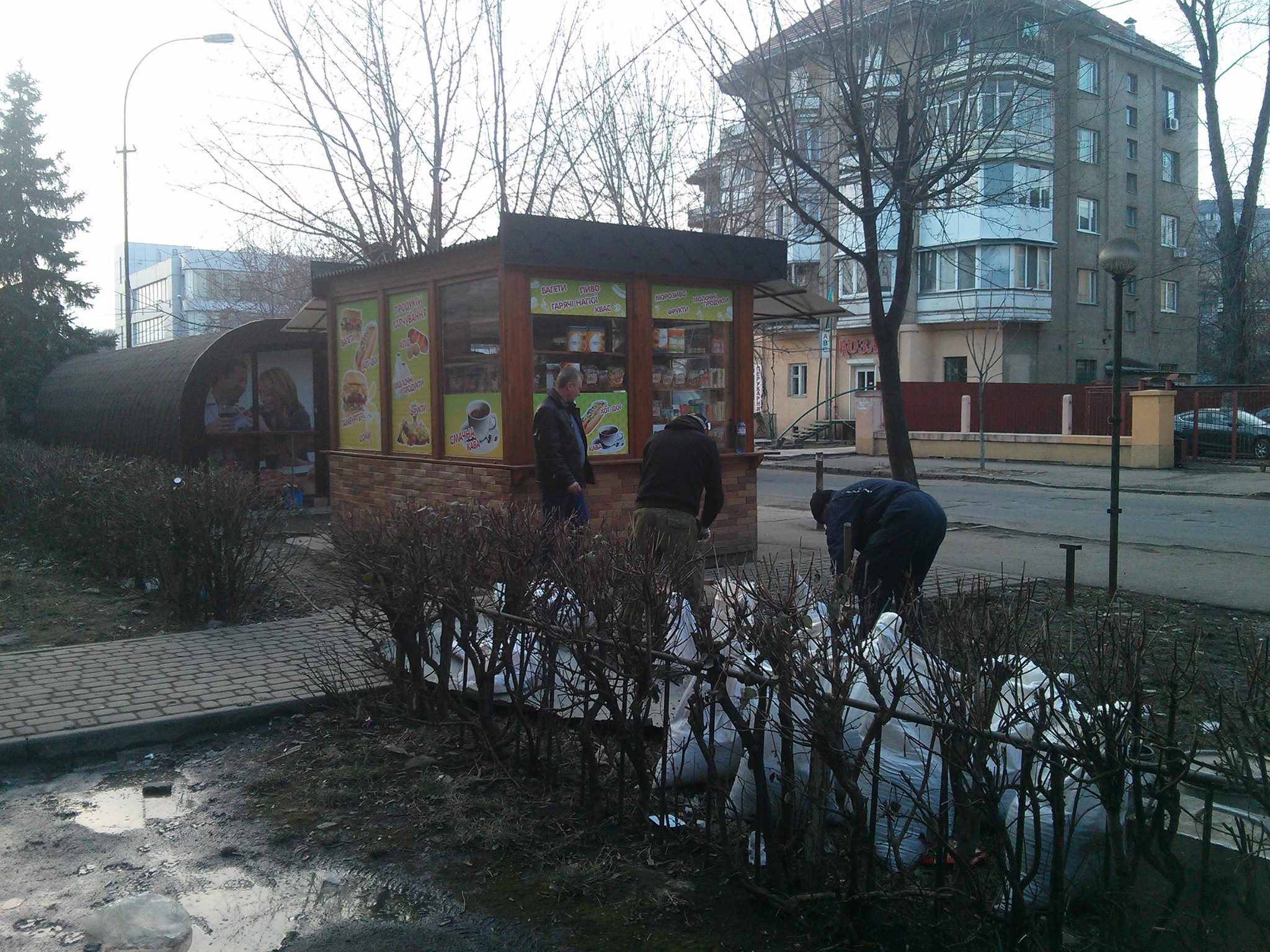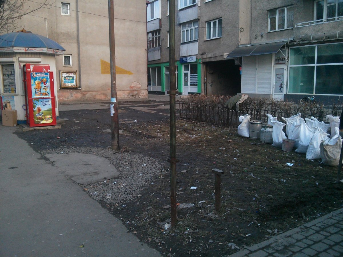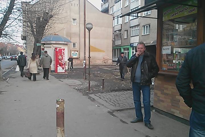 "Вчора 21.02.2015 близько 17:00 проходячи повз нейрохірургії обласної ЦКЛ по вул. Капушанській помітив що невідомі мені особи приїхавши на ГАЗ-ельці почали вигружати цемент та пісок на зелену зону. Невідомий мені чоловік в чорні шкіряній куртці розмітив зелену зону коликами "на глаз" та дав команду двом робітникам копати. Підійшовши до них та запитавши що вони копають відповіли, що фундамент для чого та для кого не зізналися. Чоловік котрий керував роботою теж не надав дозволи та відмовлявся давати пояснення. Після чого я почав викликати 102.