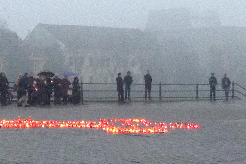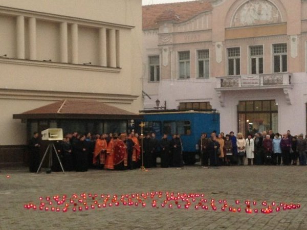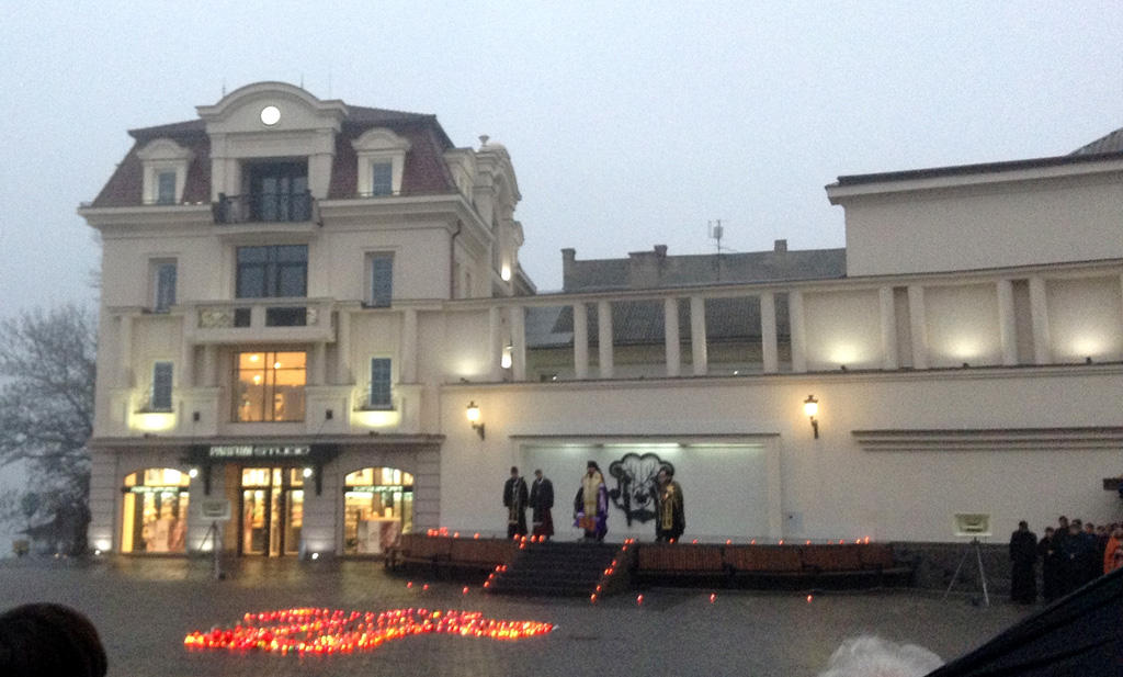 У центрі площі Театральної виклали символічний хрест і запалених свічок, духовенство відслужило молебень, вся площа завмерла у хвилині мовчання, шануючи душі мільйонів жертв голодоморів.