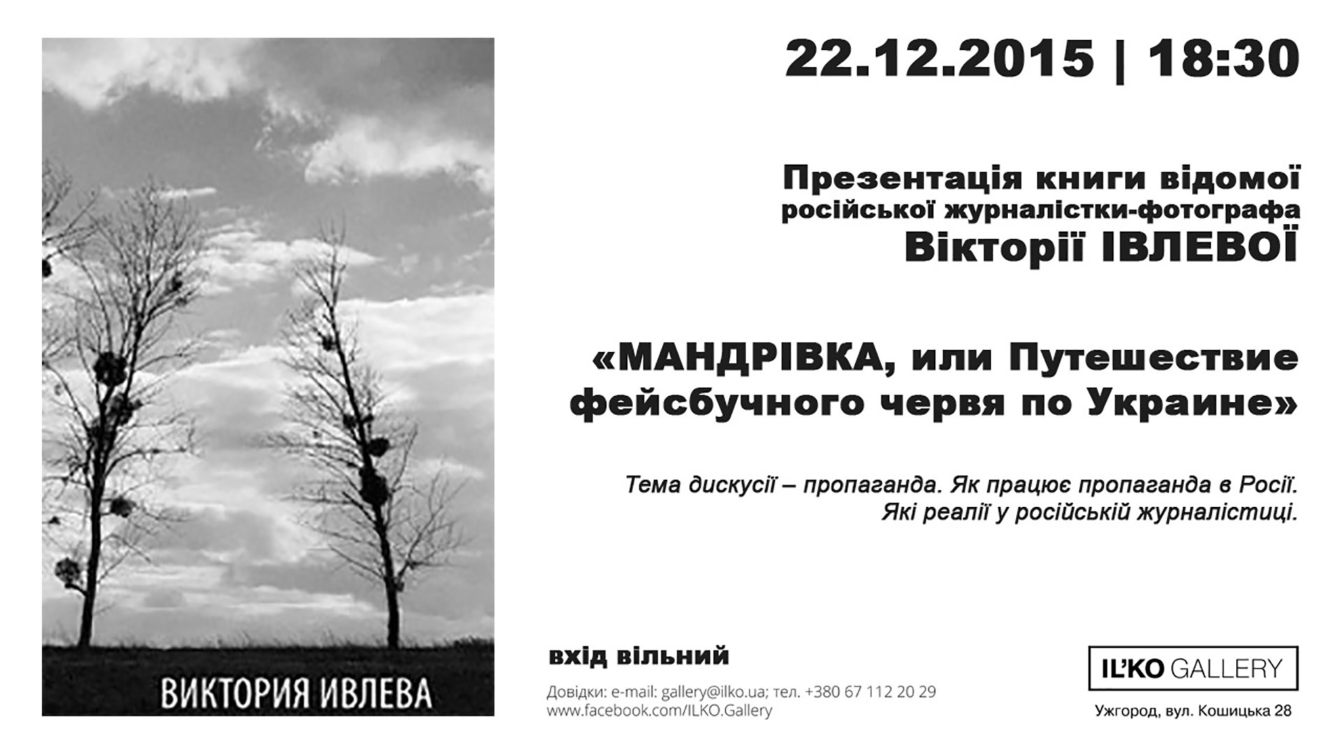 22 грудня 2015 року у Галереї Ілько о 18.30 відбудеться презентація книги авторки «МАНДРIВКА, или Путешествие фейсбучного червя по Украине».