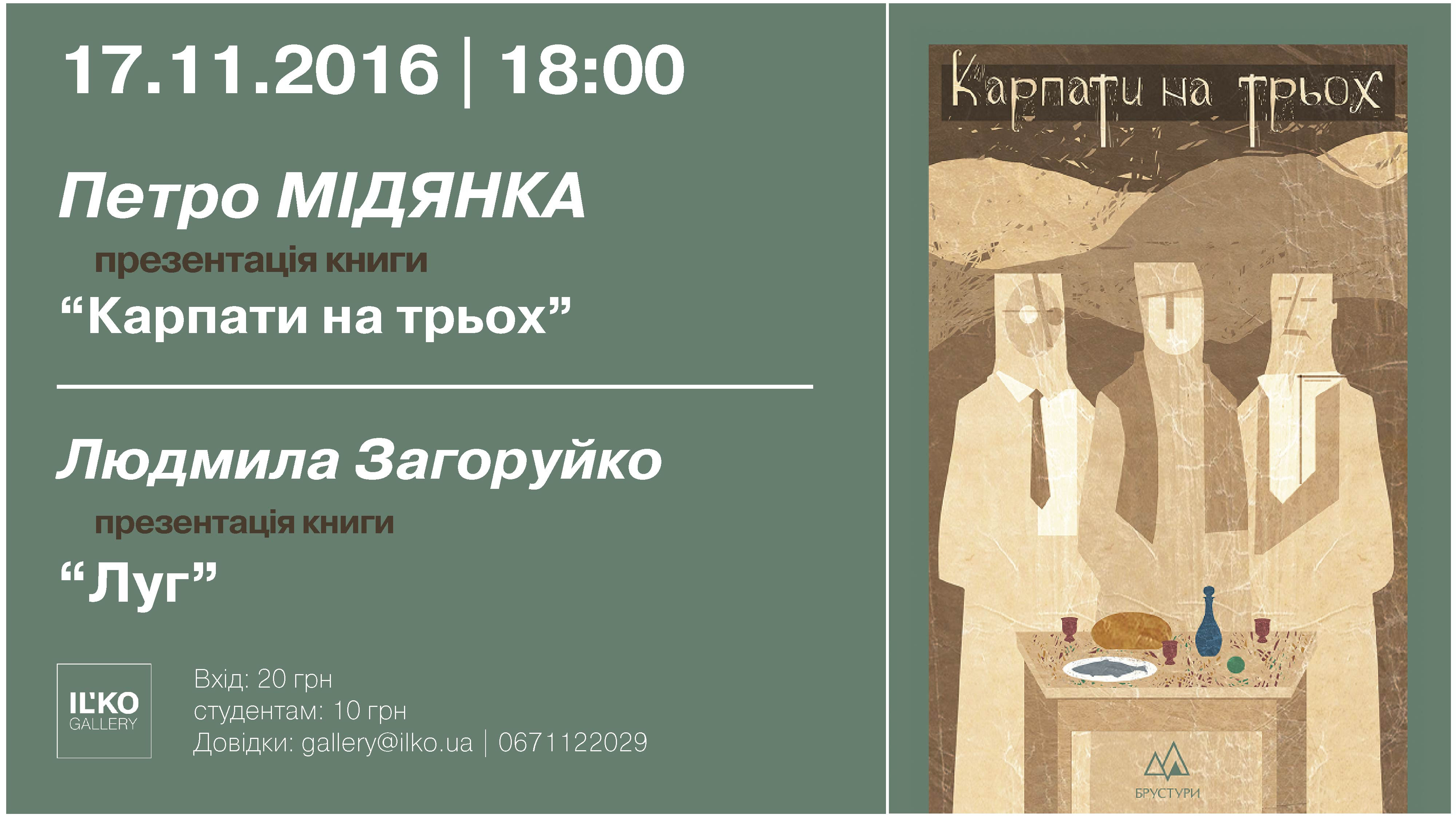 Крім того, в цей же вечір презентуватиметься роман у новелах Людмили Загоруйко "Луг", виданий у "Лірі". Авторка народилася в Ужгороді, зараз же мешкає в Широкому Лузі, і про філологічний результат такого переїзду Петро Мідянка пише: "Мені важко назвати когось із письменників, де в рафіновану російську мову так органічно вживлено марамороські діалектизми."