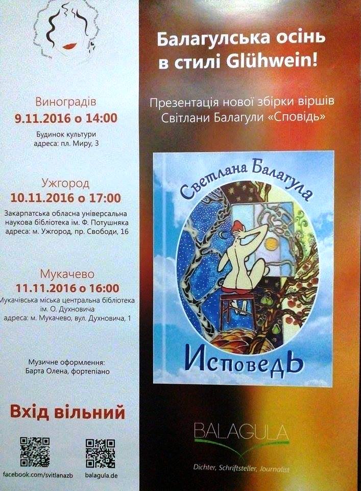10 листопада о 17.00 у головній книгозбірні краю (пр.Свободи,16) відбудеться творчий вечір київської письменниці Світлани Балагули, яка презентує свою нову збірку поезій « Исповедь».