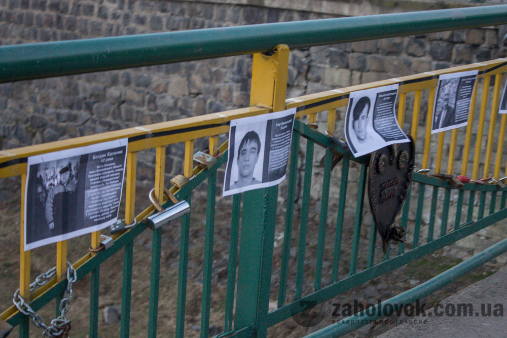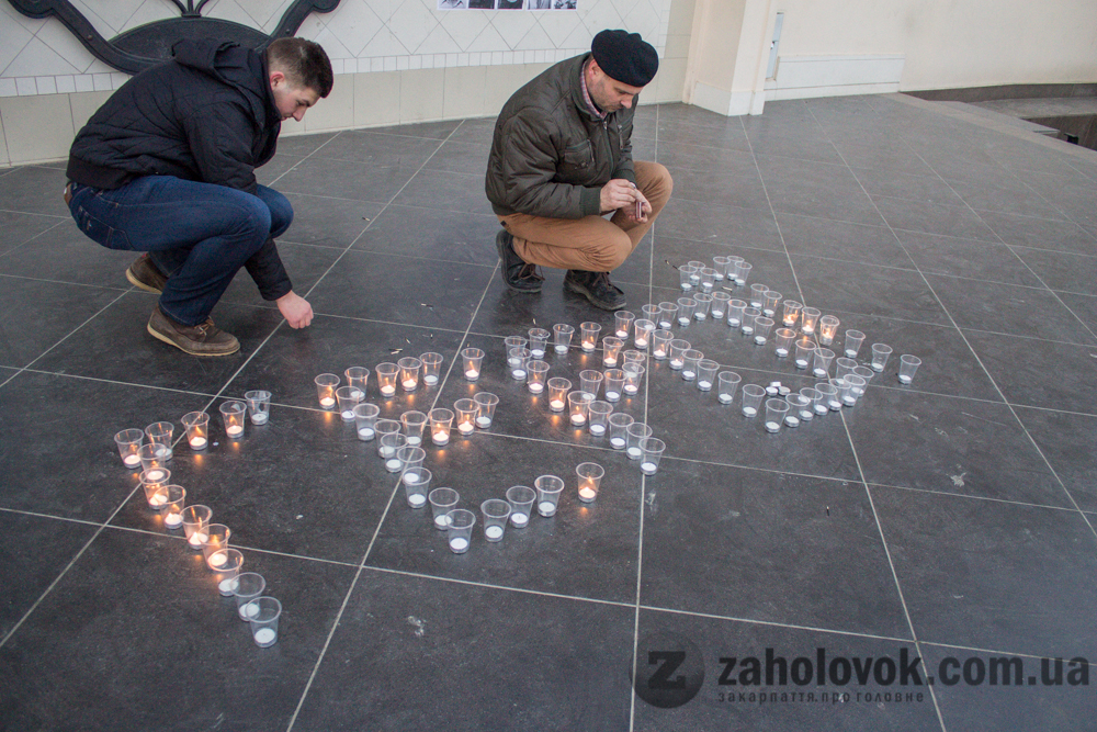 Що цікаво на площі Театральній молоді УДАРівці влаштували власне дійство. Вони, зокрема, розвісили на самій площі, а також на пішохідному мості зображення всіх героїв Небесної Сотні. Окрім того ще й виклали слово герої зі свічок.