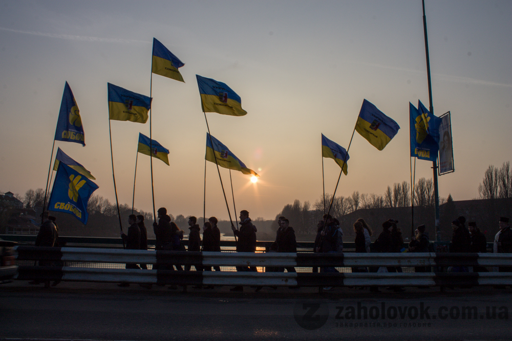 Урочистою ходою близько 200 людей пройшли від площі Народної через транспортний міст, проспект Свободи, вулицю Швабську, площу Петефі, Корзо до скверику Небесної Сотні, що навпроти СБУ.