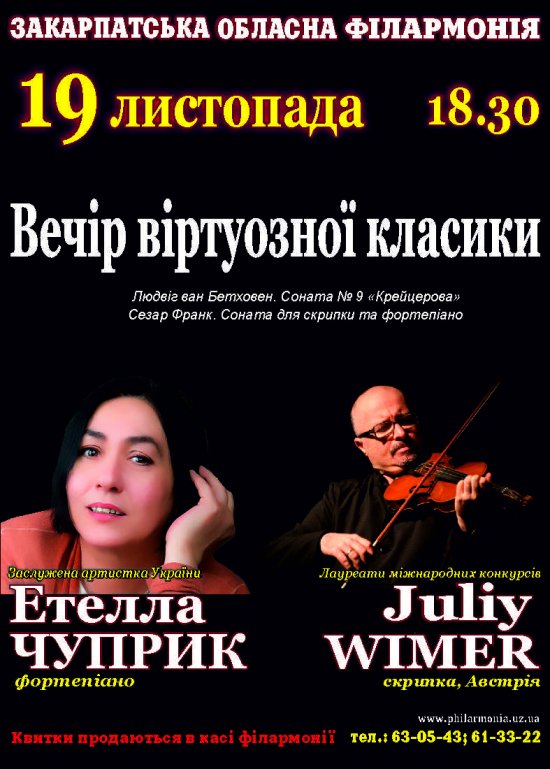 19 листопада у Закарпатській обласній філармонії відбудеться концерт «Вечір віртуозної класики».